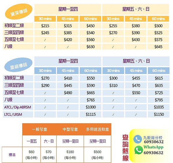 九龍灣分校設各類管弦樂樂器課程,種類齊全,專業導師均經過嚴格挑選,並定期提供專業培訓,以確保導師質素。